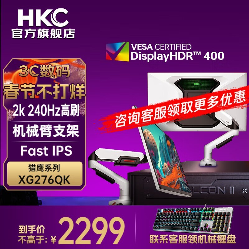 HKC 27英寸显示器1989元入手,2K+240Hz+HDR400!