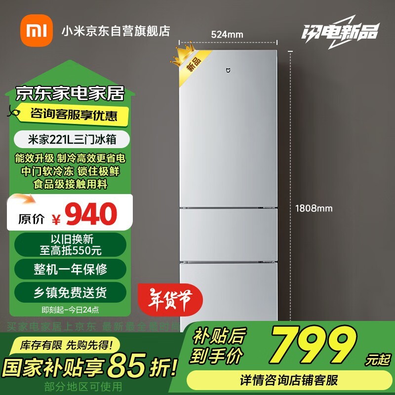 国补价699元!小米221升三门小型家用电冰箱到手价699