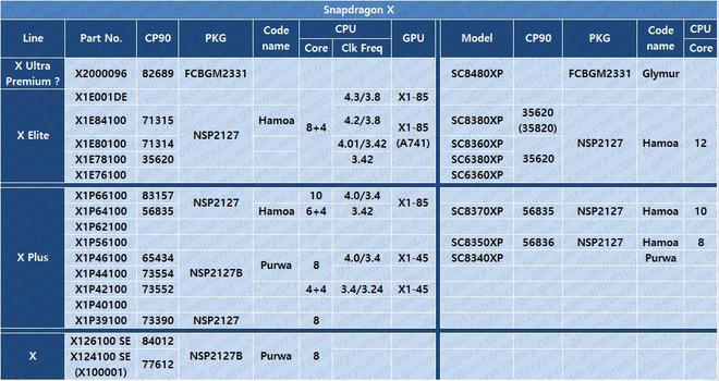 代号 Glymur,此前传闻为第二代骁龙 X 系列的低端型号,与代号 Mahua、Purwa 类似。其封装为 FCBGM2331,由台积电生产,并与 Glymur 使用相同的 PMIC(代号 Superfury)。相比前代 Hamoa 的 NSP2127 封装,规模明显增大。