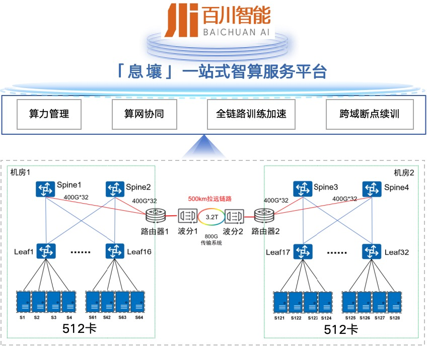 在广域智联无损网络技术方面,中国电信创新广域无损调度算法、关键帧识别技术,将带宽收敛比提升到32:1;创新WSON 50ms极速倒换技术,实现长距链路中断无感知切换。系列技术有效解决了长距离传输中网络拥塞丢包、链路故障、建网成本等问题,确保了训练过程的稳定性和高效性——在500公里的长距离传输下,网络传输吞吐率仍能保持在较高水平,为千卡千亿参数商用大模型的联合训练提供了坚实的网络支撑。与此同时,息壤平台支持算力插件、跨地域算网协同、跨数据中心自动并行、断点续训等一系列关键技术能力,实现故障秒级定位、分钟级处理与恢复,保证了百川千亿参数商用模型的快速部署和稳定高效运行。