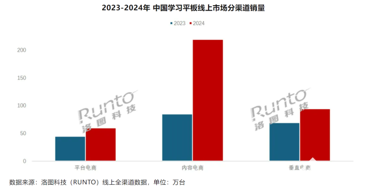 渠道方面,2024年电商平台是学习平板销售的主力渠道。2024年,中国学习平板线上市场的零售量达393.7万台,在全渠道中的占比为66.5%。线上各渠道均实现了销量的同比上涨,其中内容电商的同比涨幅最大,达158.9%。