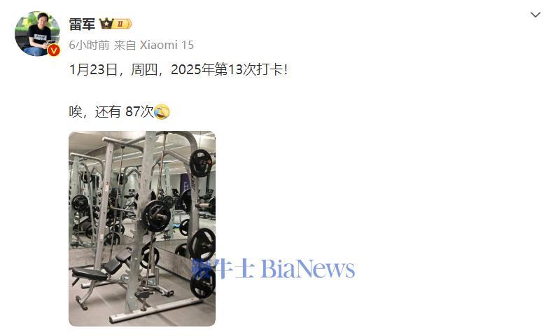 元旦期间,小米CEO雷军在提出2025年要在健身房打卡100次的小目标。今日,雷军已经完成了今年的第13次打卡。