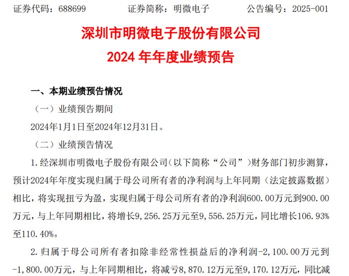 1月23日,深圳市明微电子股份有限公司发布2024 年年度业绩预告,预计2024年年度实现归母净利润与上年同期(法定披露数据)相比,将实现扭亏为盈,实现归母净利润600.00万元到900.00万元,与上年同期相比,将增长9,256.25万元至9,556.25万元,同比增长106.93%至110.40%。