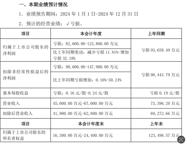 相比上年同期的7.34亿元有所下降,净亏损预计在8.26亿至12.38亿元之间,同比亏损减少11.81%至增加亏损32.18%,上年同期净亏损为9.37亿元。