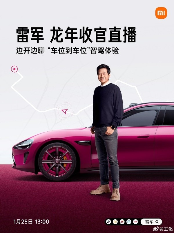 【CNMO科技消息】1月23日,CNMO了解到,雷军将于1月25日(本周六)下午1时举办一场龙年收官直播活动,边开边聊“车位到车位”智驾体验。同时,这场直播还将首次展示小米SU7璀璨洋红配色实车。
