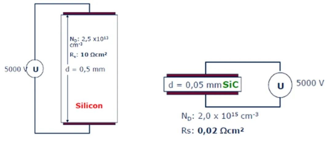 功率开关器件的耐压与其漂移区的长度和电阻率有关,而MOSFET是单极性功率开关器件,其通态电阻又直接决定于漂移区的长度和电阻率,与其制造材料临界击穿电场强度的立方成反比。因为4H-SiC有10倍于Si的临界击穿电场强度,因此基于SiC的功率器件允许使用更薄的漂移区来维持更高的阻断电压,从而显著降低了正向压降以及导通损耗,同时减小热阻。