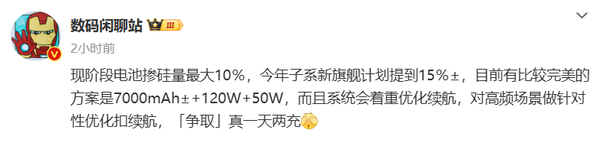 值得关注的是,一套近乎完美的续航系统方案已经浮出水面。该方案结合了约7000mAh的硅负极电池、120W的有线快充以及50W的无线快充,不仅满足了用户对大电池的需求,同时在快速充电与机身重量、厚度之间找到了一个巧妙的平衡点。