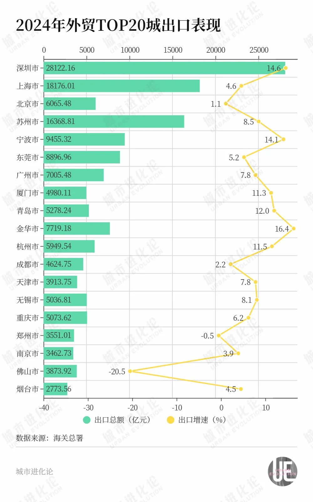 但同在大湾区的佛山,则正在经历外贸低谷。2024年,佛山进出口同比下降了16.2%,在外贸TOP20城中增速垫底。