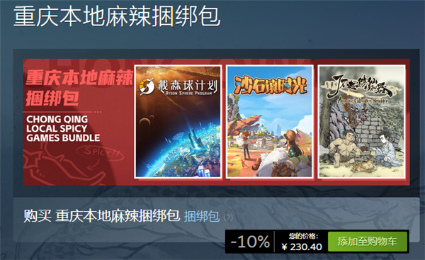 快科技1月23日消息,Steam推出“重庆本地麻辣捆绑包”,内含《沙石镇时光》《戴森球计划》《了不起的修仙模拟器》三款游戏。