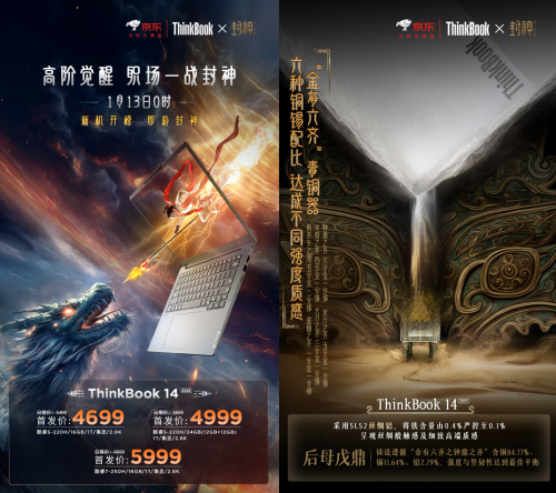 值得一提的是,在《封神》第二部即将上映之际,京东还携手ThinkBook与《封神》官方联名,也一同努力让广大的《封神》粉丝能更快入手赋予了更多电影元素的ThinkBook 14 2025酷睿版新品。其中,新品机身采用5L52丝绸铝,将铁含量由0.4%严控至0.1%,呈现丝绸般的高级感,让粉丝们能在使用新品电脑时获得“神兵”一般的触感。