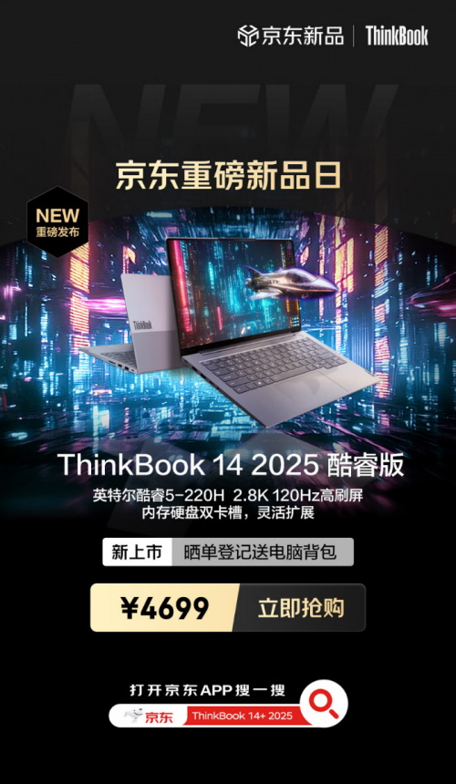 ThinkBook 14 2025酷睿版新品笔记本电脑在京东先人一步首发,首发售价4699元起。即日起至31日的首发期间,来京东购买ThinkBook 14 2025酷睿版并晒单,可获赠ThinkBook双肩背包一个。作为与电影《封神》IP联名的重磅新品,28日前在京东下单ThinkBook 14 2025酷睿版14英寸16G 1T新品,还可获得《封神第二部:战火西岐》电影票,数量有限,先到先得。打开京东APP搜索“ThinkBook 14+2025”,即可选购这款性能卓越的笔记本电脑新品。