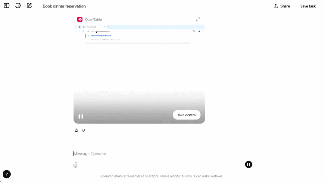 用户确认:在完成任何重要操作(例如提交订单或发送电子邮件)之前,Operator 会征求批准。