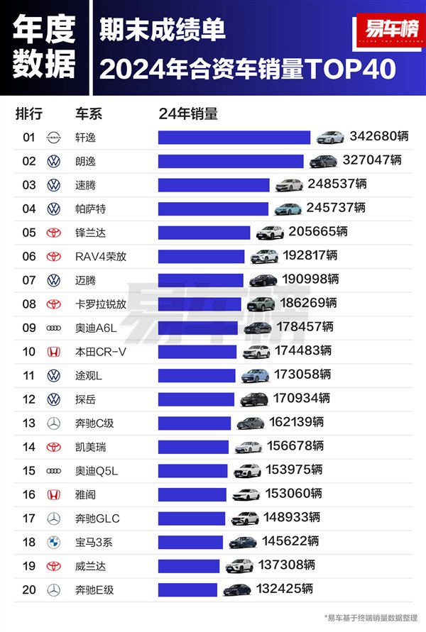 快科技1月24日消息,易车榜日前发布了2024年合资车型销量榜Top40。