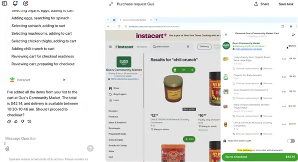 在另一个案例中,用户上传了一张写有“鸡蛋、菠菜、蘑菇”等杂货的购物清单,要求Operator去买菜网站上进行操作。随后AI就会打开浏览器,顺着清单逐一搜索并加入购物车。