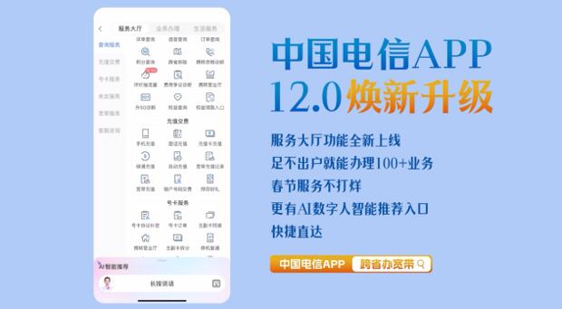 在新春佳节之际,中国电信APP12.0正以满满的科技感,携带着一系列酷炫又贴心的功能,向用户发送新春的“智”趣邀请。快来中国电信APP解锁AI拜年新姿势,开启更多AI智能服务吧!