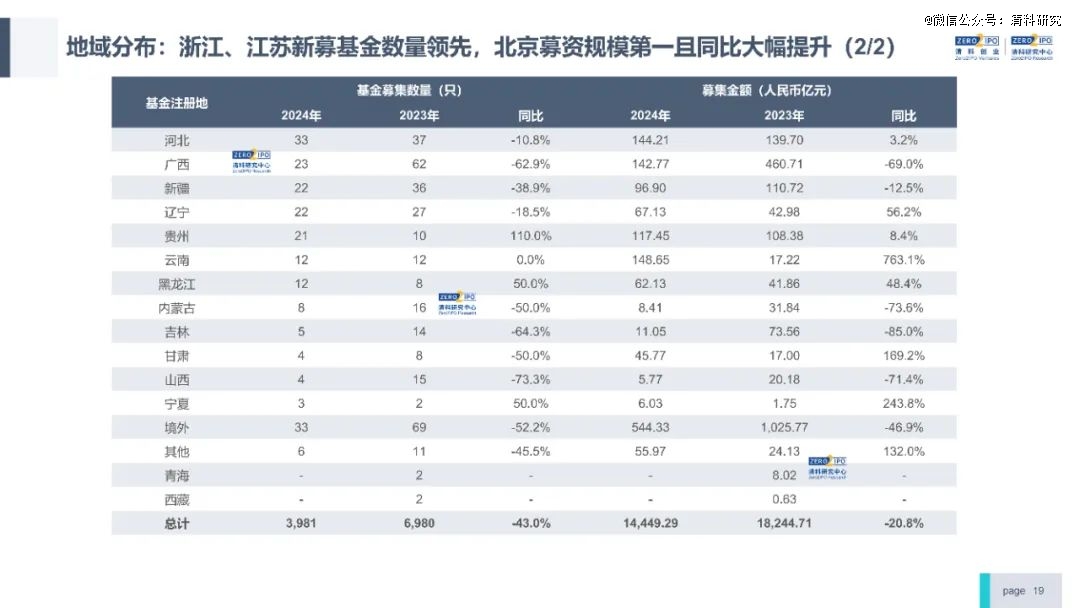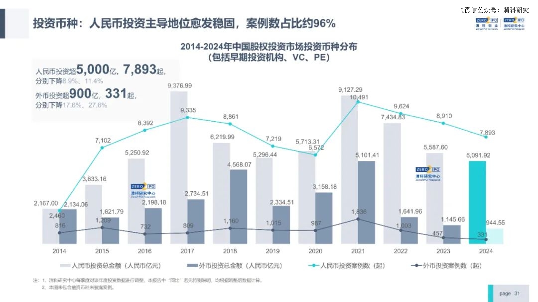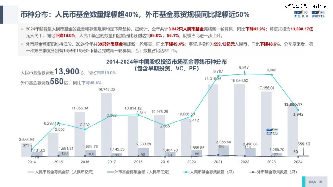 募资方面,2024年募资新募集基金数量和规模分别为3,981只,1.44万亿元,同比下滑43.0%、20.8%。2024年下半年险资、AIC、国资发起设立了多只大额基金,募资规模降幅持续收窄。分币种看,外币基金募资仍维持低位,全年共39只外币基金完成新一轮募集,募资规模约为559.12亿元人民币,同比降幅分别达到49.4%、48.6%。