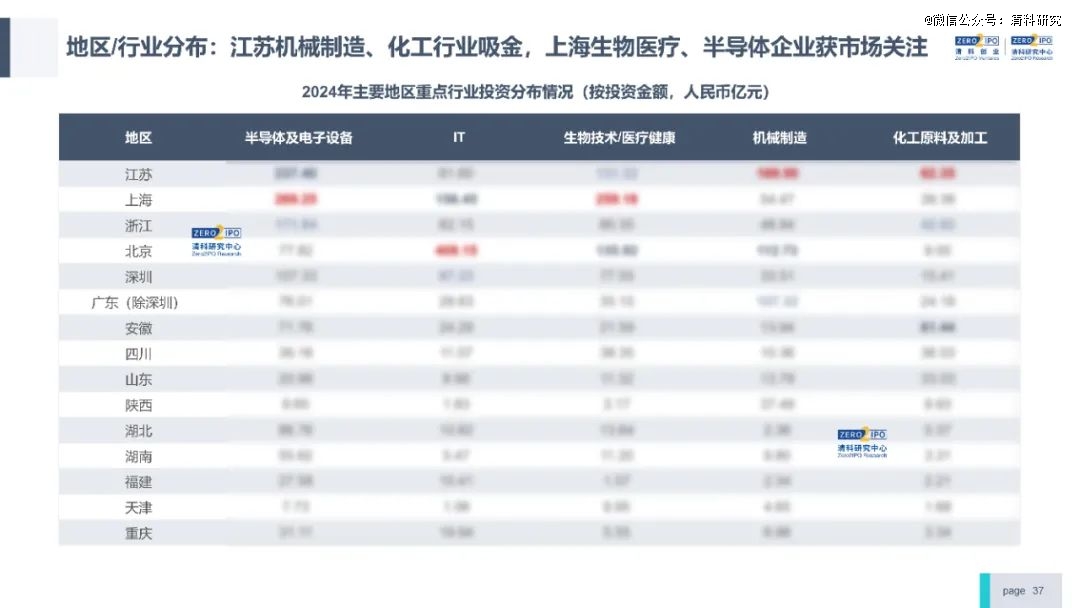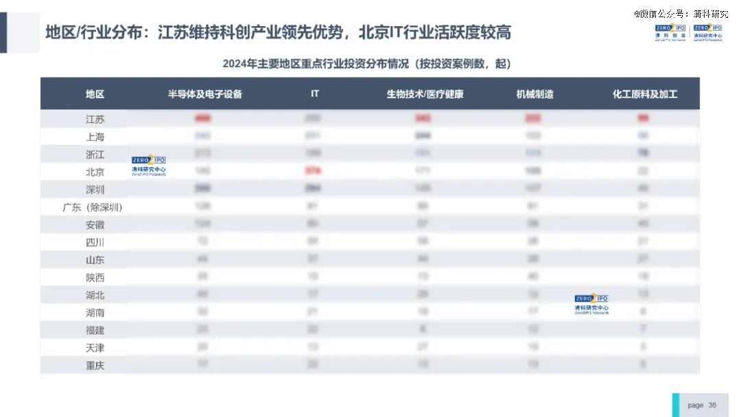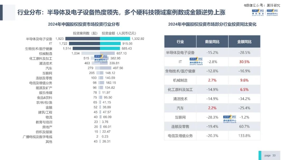 投资方面,2024年投资案例数共8,408起,剔除极值案例后披露金额6,036.47亿元,同比降幅分别为10.4%、10.3%,与前三季度相比进一步收窄。分行业看,硬科技领域仍为市场热点,半导体及电子设备领域获投金额超千亿,机械制造领域案例数及金额逆势上涨。