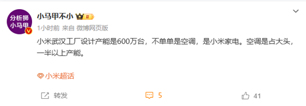 该博主表示,小米武汉工厂设计产能是600万台/年,这些产能不单是空调,而是小米整个家电,不过,空调占据半壁江山,有一半以上的产能。