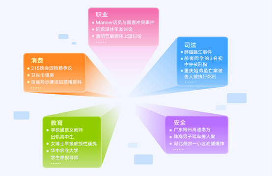 社会民生相关议题往往是社会情绪的“培养皿”。网友会“用脚投票”,在讨论中表达自己的关切。微博通过对2024年S级社会事件热搜的抽样编码,发现司法、安全、消费、教育、职业是公众最为关心的五类民生热点话题。