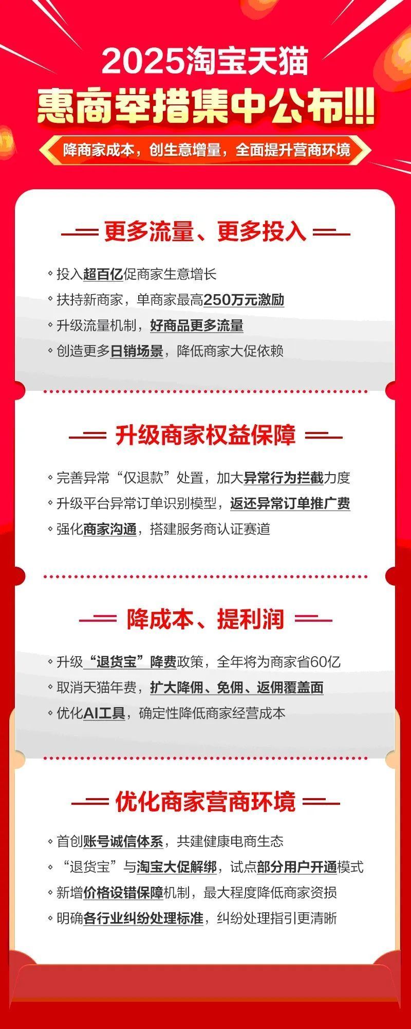 在此次集中公布之前,淘宝天猫已经推出了多项举措改善营商环境。2024年7月,淘宝天猫上线“体验分”并官宣松绑“仅退款”;9月,上线“退货宝”……