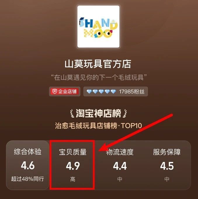 “山莫”虽然是小店,但去年入选“淘宝神店榜”“治愈毛绒玩具店铺TOP5”,并坐拥“商品体验优秀”“一年回头客6000”等极具消费影响力的重要标签。其热销的“爱鱼企鹅可爱挂件”,好评率高达99.3%。