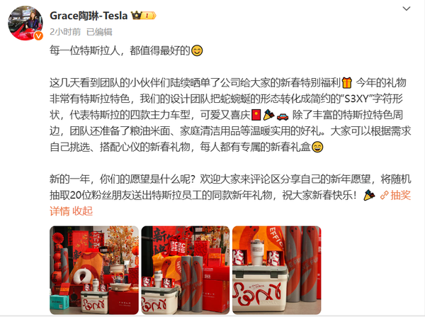 陶琳晒特斯拉员工新春福利