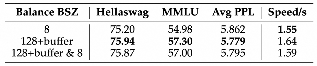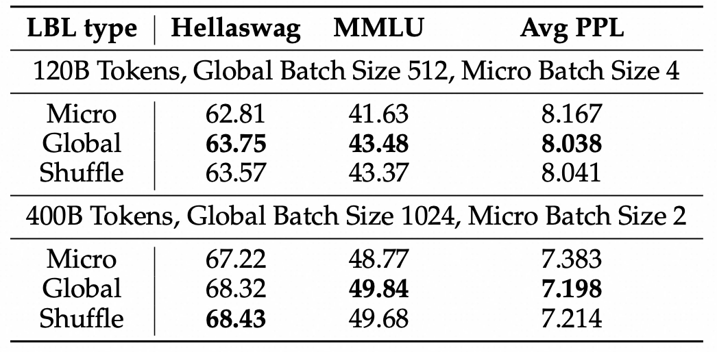 我们发现,shuffled batch balance 和 global batch balance 的表现几乎一致,都显著好于 micro batch balance。说明,引入 global-batch 获得提升的首要原因是在一个更加通用、多样的 token 集合上计算损失。进而验证了我们的出发点和假设。