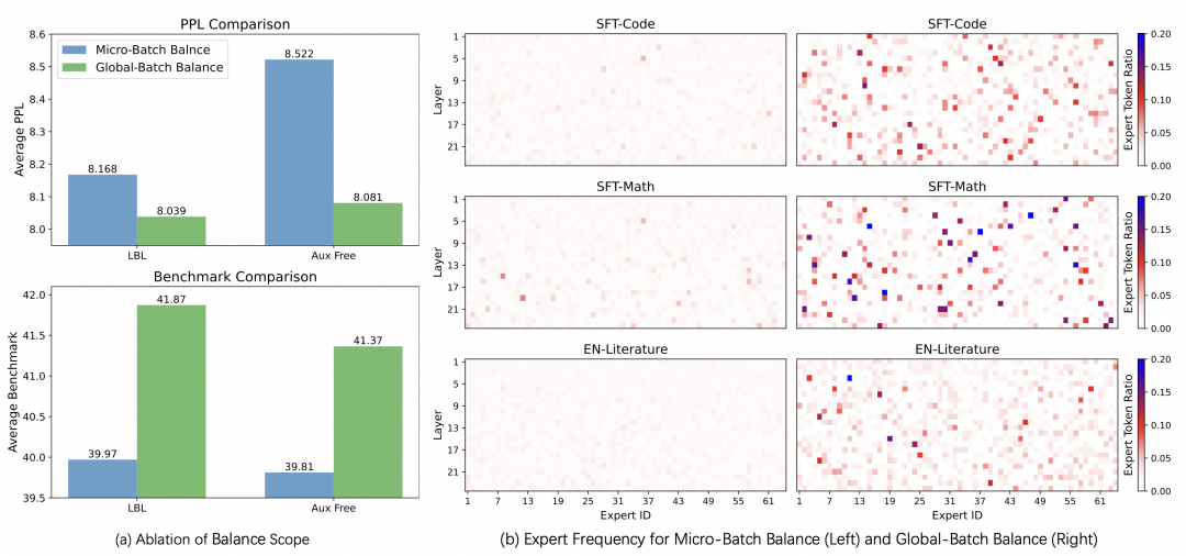 这项工作也被应用到 deepseek-v3 的训练中。deepseek-v3 的技术报告(同期工作)中强调了这项技术的专家选择频率是基于 global-batch 进行计算,并在小规模上讨论了基于global batch 使用 LBL 的结果,也发现这两种方法结果相似。