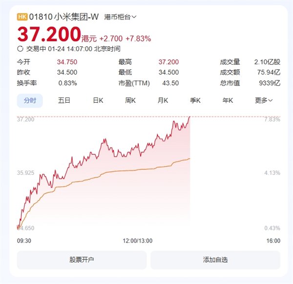 快科技1月24日消息,小米集团午后涨超7%,报37.2港元/股,总市值破9300亿港元,再创历史新高。