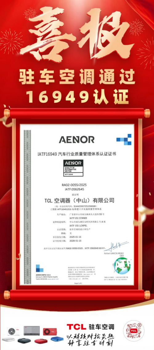 据悉,IATF 16949是由国际汽车推动小组(IATF)和国际标准化组织(ISO)共同制定的针对汽车行业的质量管理体系标准,旨在持续改进、强调缺陷预防以及减少供应链中的变差和浪费。获得此认证,充分证明了TCL驻车空调在设计开发、生产和服务过程中的高质量水平。
