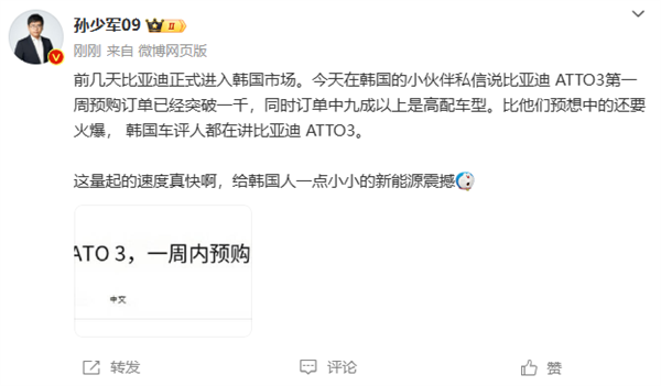 据博主“孙少军09”透露,比亚迪在韩国市场投放的首车ATTO 3第一周预购订单就突破了1千台,其中订单中九成都是高配车型,“比预想中还要火爆,韩国车评人都在讲比亚迪ATTO 3”。