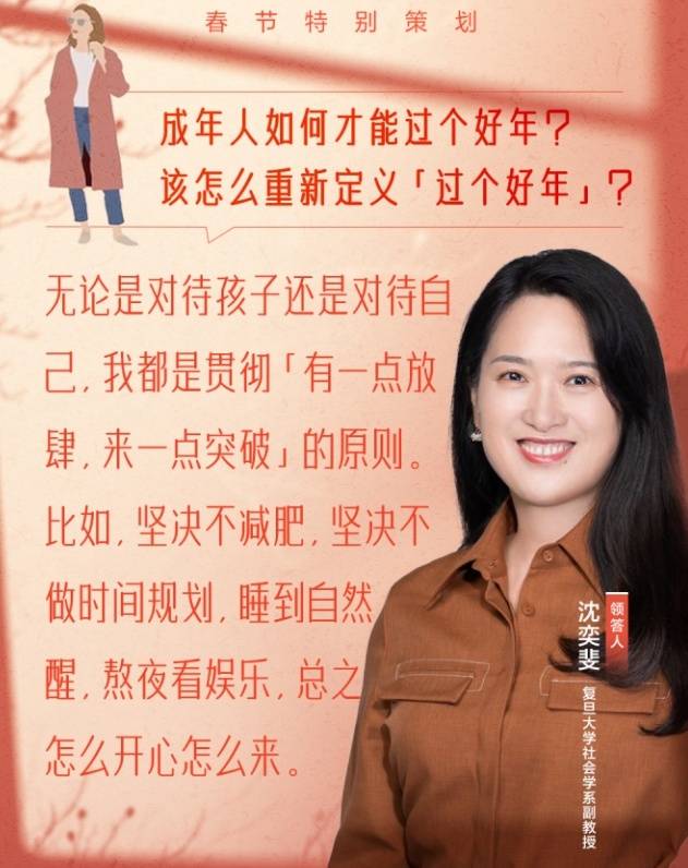 据复旦大学社会学系副教授沈奕斐在“吾辈问答”春节策划上回忆到,过年,不仅是为了短暂的放松与欢笑,也需要让平淡的日子有被闪光记忆点亮。她表示,自己会主动制造诸如“不减肥、熬夜看娱乐节目”等放肆的生活方式,“这种生活方式在过年中,就是为了提醒我们,生活本应有片刻的无拘无束,一点点的放肆,一点点的突破”。