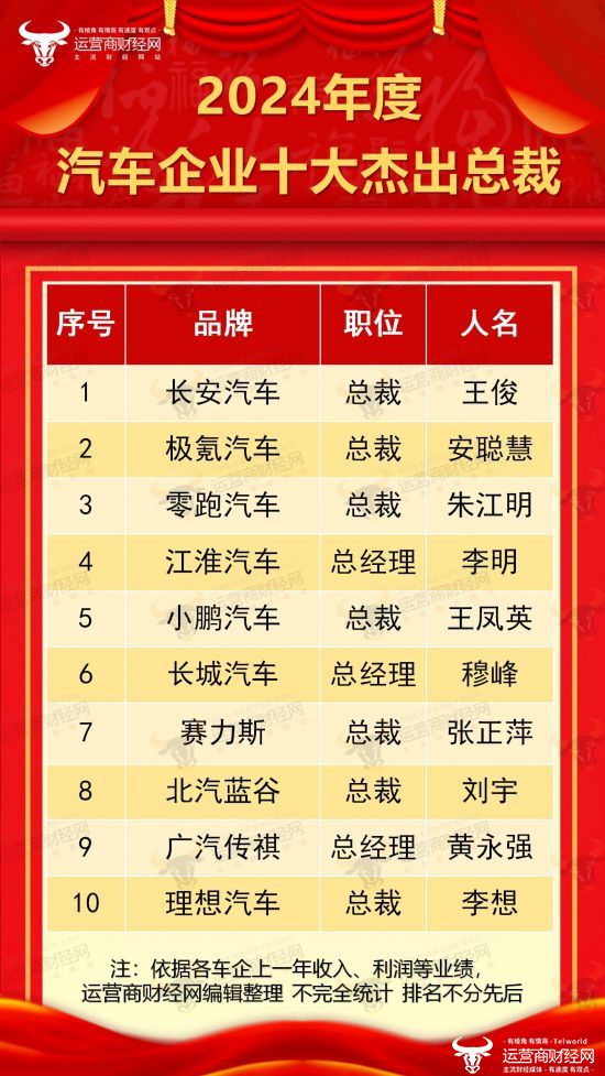日前,国内主流财经、科技、汽车资讯网站运营商财经网正式推出“2024年度汽车企业十大杰出总裁”榜单。都有哪些车企的总裁榜上有名?接下来运营商财经网将一一揭晓。
