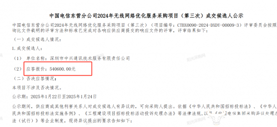 第三次采购则比较顺利,在询比公告发布的8天后就公布了成交候选人,其显示中标人为深圳市中兴通讯技术服务有限公司,应答报价为54.06万元。