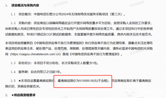 值得一提的是,项目设置了最高应限价,其金额为51.5万元(不含税),且称若供应商响应报价高于最高限价的,其响应将被否决。