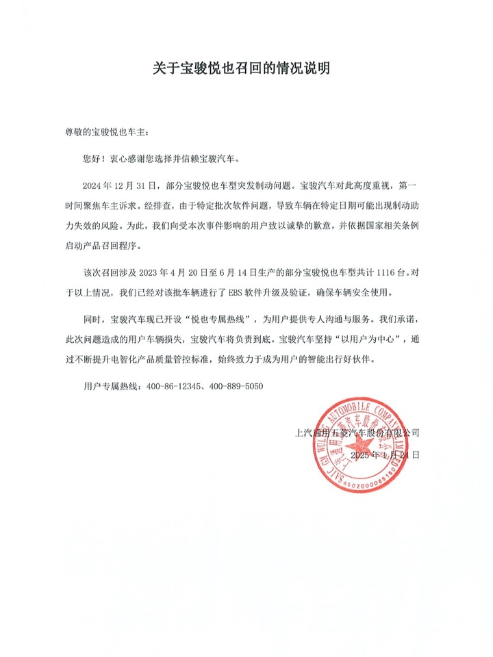 同在今日发出召回公告的汽车品牌还有宝骏,隶属于上汽通用五菱汽车股份有限公司的宝骏汽车发布情况说明和公告表示召回部分宝骏悦也汽车。相关公告如下:
