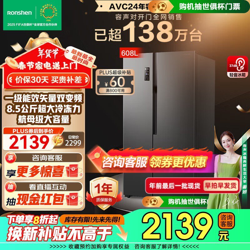 容声(ronshen)608升离子净味双开门冰箱,到手价1473元