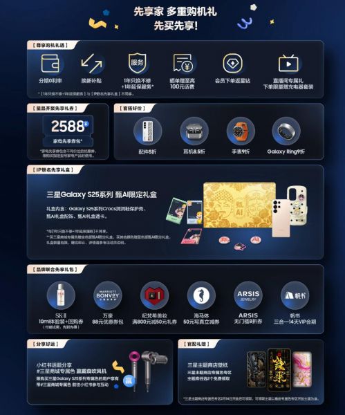 不仅如此,「先享家」用户还能专享甄AI限定礼盒或1年只换不修+1年延保服务二选一礼遇,以及晒单即赠话费、会员专享星钻返现、直播间互动赢好礼、品牌联合礼包、2588元优惠券包等多重福利;搭配购优惠更是低至五折起,让用户在享受Galaxy S25系列的同时,也能轻松拥有心仪的配件与周边,打造专属的智能生活圈。另外,参与小红书#三星商城专属色话题分享,还有机会赢取戴森吹风机等大奖。