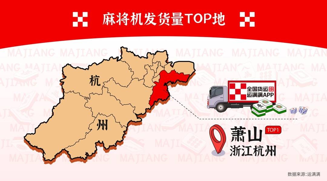 据运满满数据显示,自2024年10月以来,全国麻将机发货量最多的五个省份依次为浙江、安徽、四川、湖北、广东。麻将机生产看浙江,浙江生产看萧山。据浙江在线报道,杭州萧山是全国最大的麻将机产业集群地。全国300多家麻将机整机生产厂家中,杭州就有200家左右,占比一半还多。