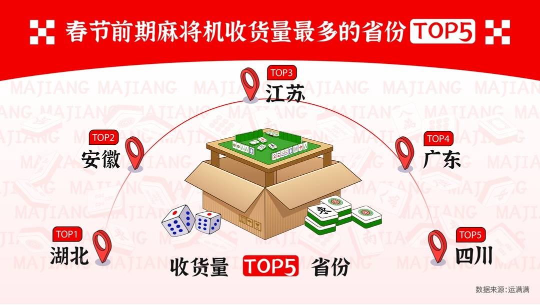 传统认知里,川渝人爱打麻将。但有意思的是,根据运满满数据显示,春节前夕麻将机收货量省份TOP5依次为湖北、安徽、江苏、广东、四川。看来,爱打麻将这件事情早已不是川渝人专属。