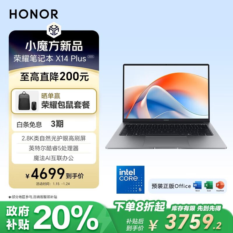 荣耀 HONOR X14 Plus轻薄本限时优惠 到手价3743元