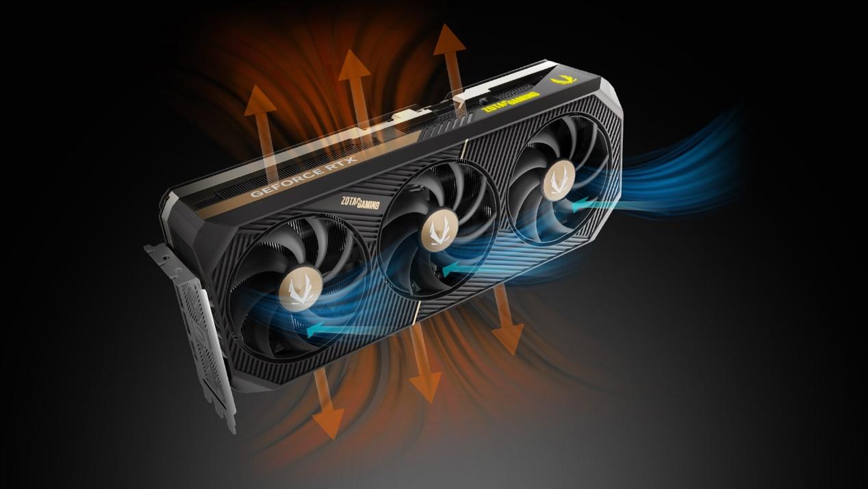 索泰GeForceRTX 5090 D SOLIDOC在风道设计上进一步优化,采用贯穿式散热设计,使风扇风流可以垂直穿透鳍片,形成全方位立体散热风道,提升散热效能。