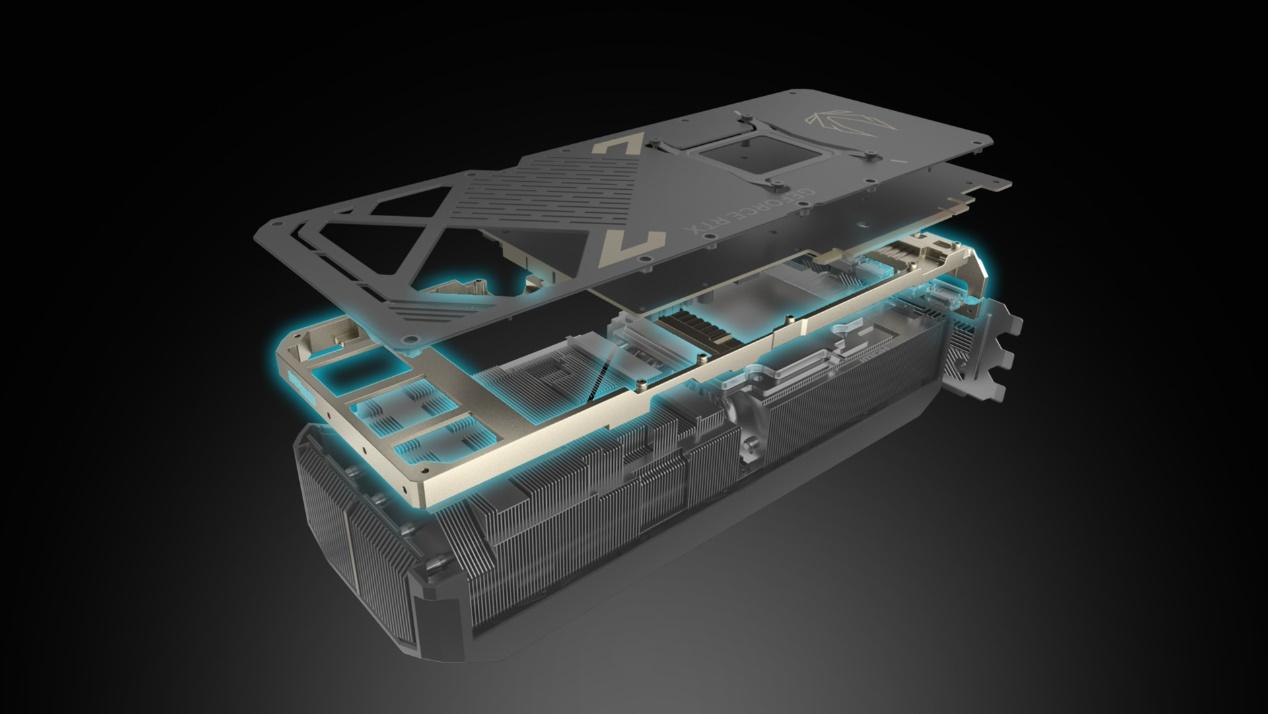 索泰GeForceRTX 5090 D SOLIDOC背板为高强度合金材料铸形而成,不仅坚固,还能辅助散热并提升静电防护能力。同时额外加有同样用高强度合金压铸成型的金属中框,提升显卡抗扭、抗压能力,大幅度增加显卡结构强度。