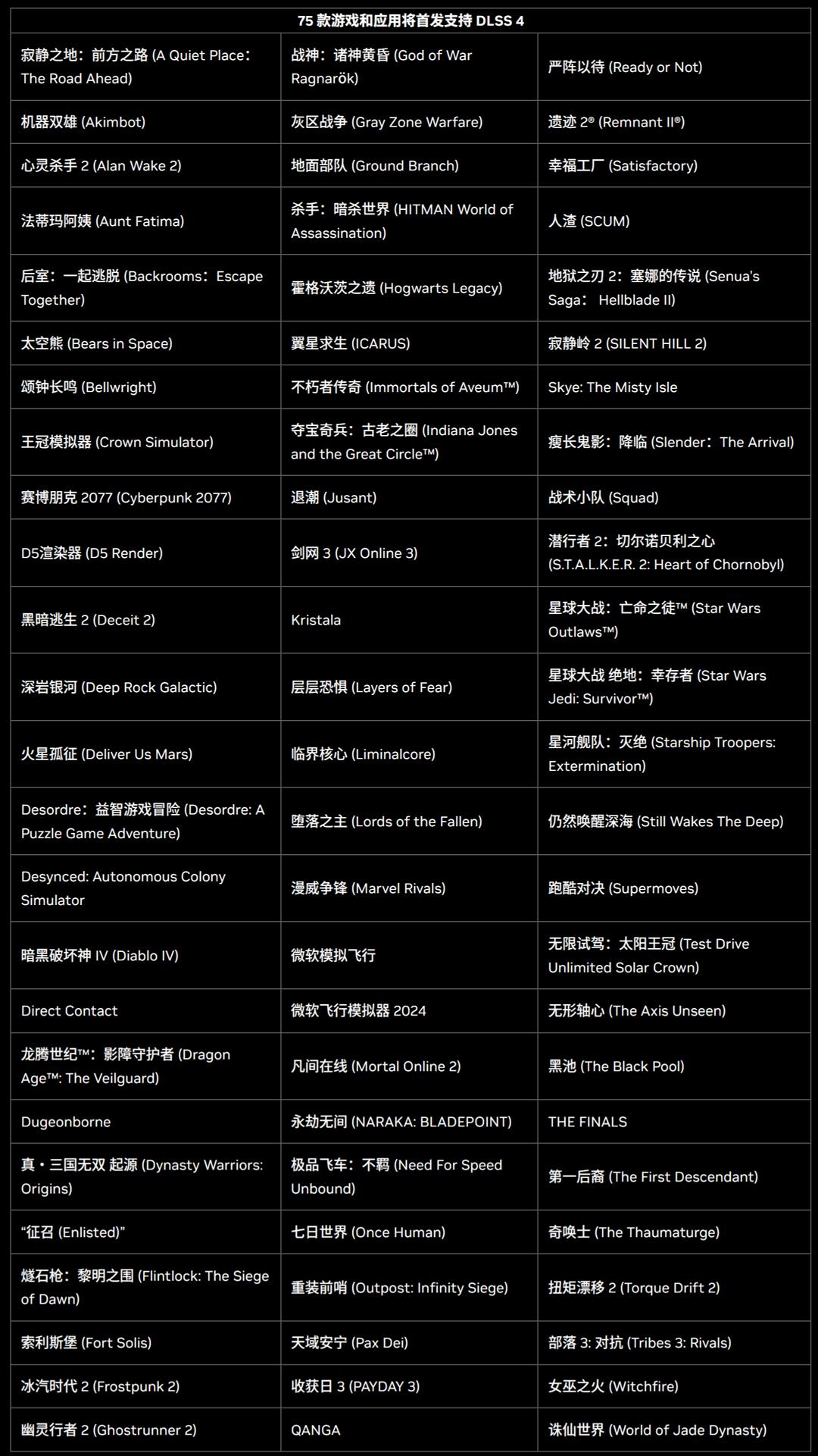 DLSS多帧生成功能由第五代TensorCore 提供支持,仅GeForceRTX 50 系列显卡可用,75款游戏和应用将首发支持DLSS4,未来更多游戏和应用也将支持该技术。