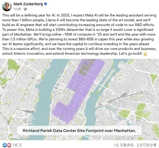 扎克伯格在公开声明中强调,2025年将是“人工智能决定性的一年”。为了实现Meta在AI领域的宏伟目标,包括为10亿人提供Meta AI服务以及使Llama 4成为业界领先的大模型,公司正在加速建设一个规模庞大的数据中心。