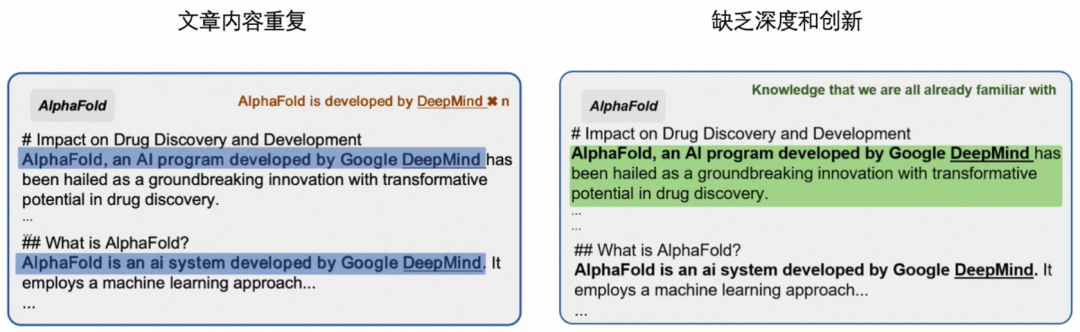 文章内容重复:如图所示,基于 RAG(GPT-4o)的框架主要依赖固定的检索策略,检索得到的内容信息单一,生成文章时可利用的信息有限,进而导致文章存在内容重复问题。