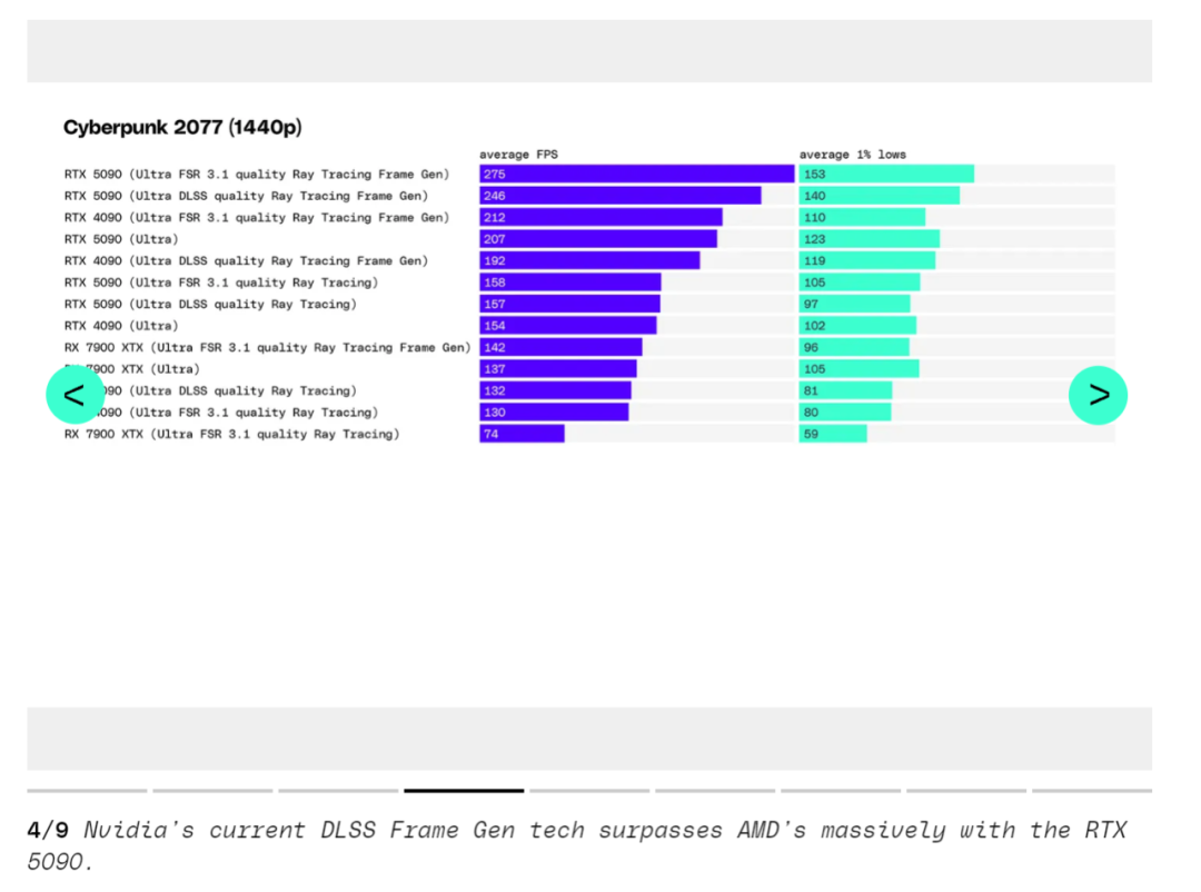 DLSS 4 的多帧生成功能显然也会在 1440p 下有所帮助,但在 The Verge 的测试游戏套件中,只有《赛博朋克 2077》在发布前支持它,所以他们的多帧生成测试集中在 4K 上。