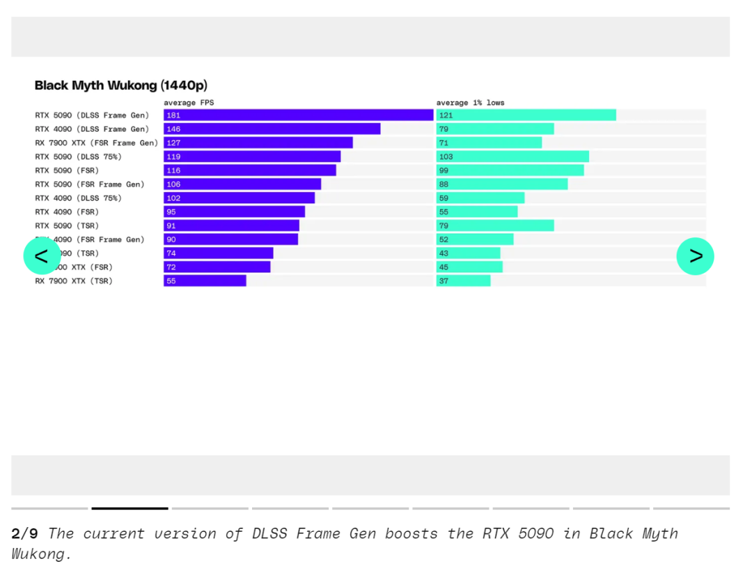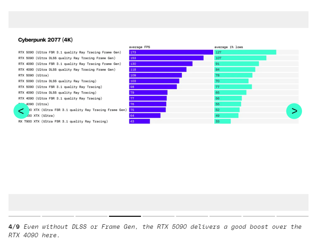 《赛博朋克 2077》和《极限竞速》是 RTX 5090 在 1440p 下比 RTX 4090 提升超过 30% 性能的罕见例子。在不启用 DLSS 的情况下,RTX 5090 在 1440p 下平均领先 RTX 4090 约 18%—— 总体提升低于上一代,在多个游戏中 RTX 4090 比 RTX 3090 提升超过 40%。