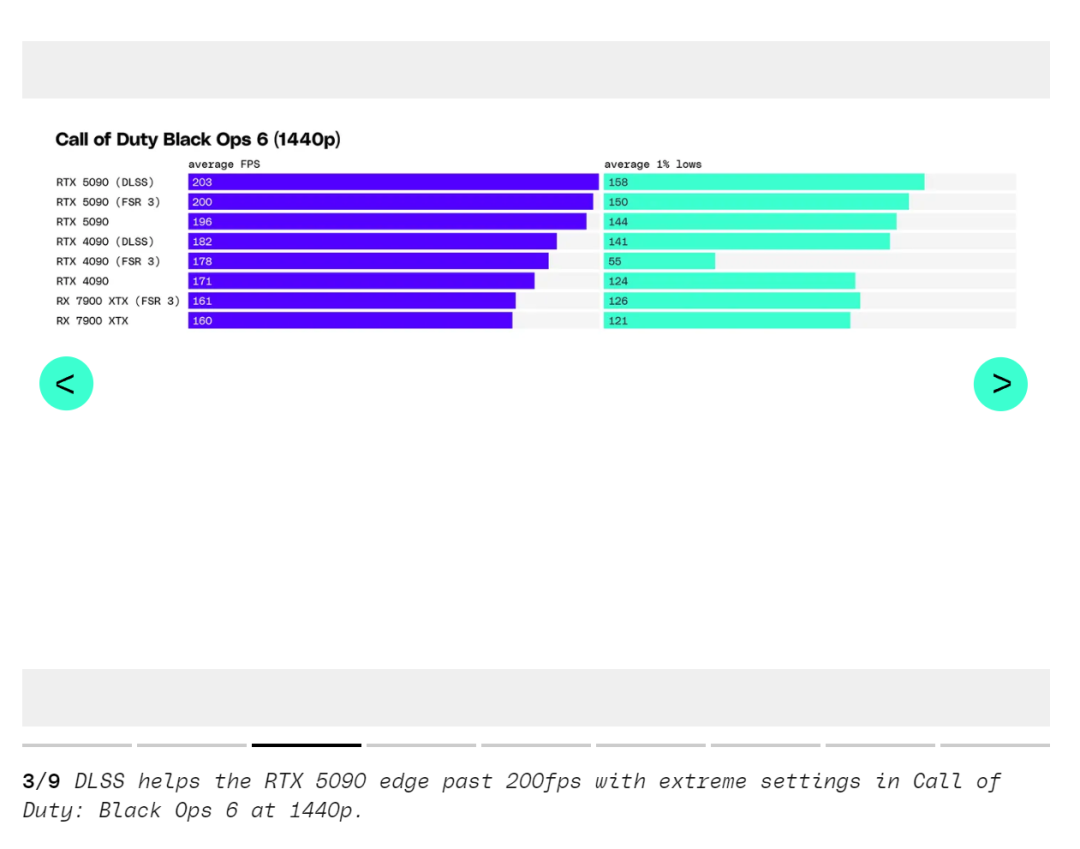 《死亡回归》在不使用 DLSS 的情况下,RTX 5090 也比 RTX 4090 快 19%,《使命召唤:黑色行动 6》的情况类似,RTX 5090 在不使用 DLSS 的情况下接近 200fps,约比 RTX 4090 高 15%。