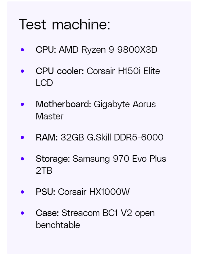 所有游戏都在 RTX 5090 上使用了非常高或超高设置进行测试,在支持的游戏中启用了各种光线追踪和升级选项,也测试了不支持 DLSS 或光线追踪的游戏。